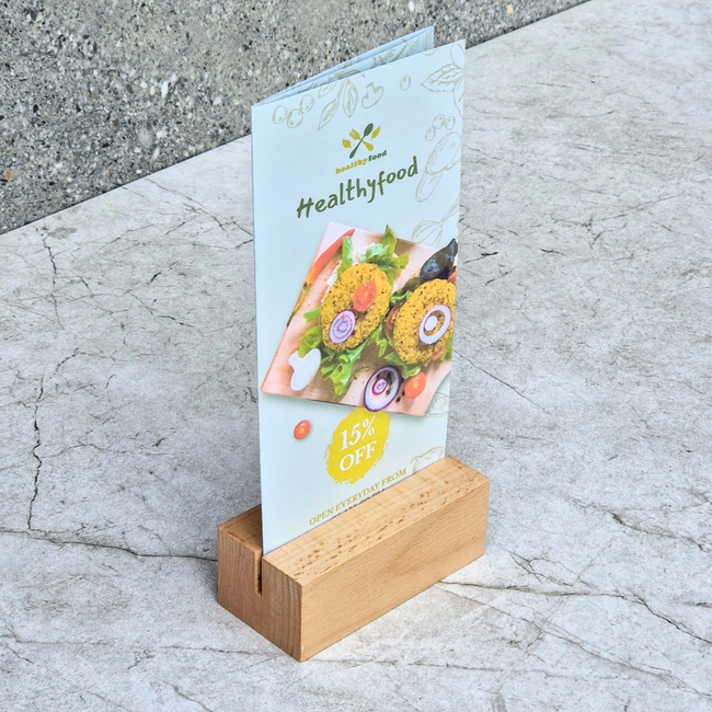 Door de stabiele houten basis blijft je kaart mooi recht staan. Dat is vooral prettig als er veel beweging is aan tafel of op de balie. Gasten pakken een kaart, zetten hem terug en het blijft er netjes uitzien. In hotels kun je deze standaard gebruiken om informatie overzichtelijk te tonen bij het ontbijt, bij de receptie of bij een ingang. In winkels is hij handig voor prijskaarten, productuitleg of korte acties bij een presentatie. En ook op beurzen of evenementen is het een snelle, compacte manier om je boodschap zichtbaar te maken zonder extra rekken of grote displays.