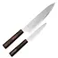 Beide messen zijn opgebouwd uit drie lagen hoogwaardig roestvrij staal met een kern van MOVAX superieur staal. Dit speciaal gelegeerd staal (chroom, molybdeen en vanadium) bereikt een hardheid van 58 HRC, wat garant staat voor langdurige scherpte, uitstekende snijprestaties en corrosiebestendigheid. De fraaie, achtzijdige handgreep van donkerbruin pakkahout biedt een ergonomische en visueel aantrekkelijke grip, met perfecte gewichtsverdeling voor moeiteloos en gecontroleerd snijden.