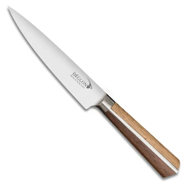 Déglon utility mes, High-Woods serie, 5Cr15MoV roestvrij staal, professioneel keukenhulpmiddel, witte eik handvat, walnoot handvat, unieke handgreepstructuur, handwas aanbevolen, lange levensduur, robuust utility mes, hoogwaardige kwaliteit.