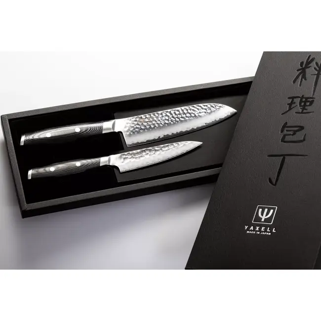 Yaxell Tsuchimon giftset, VG10 staal, Japans mes, Damaststaal, gehamerd lemmet, Micarta handgreep, levenslange garantie, santoku mes, universeelmes, keukenmessen, hoogwaardige messen.