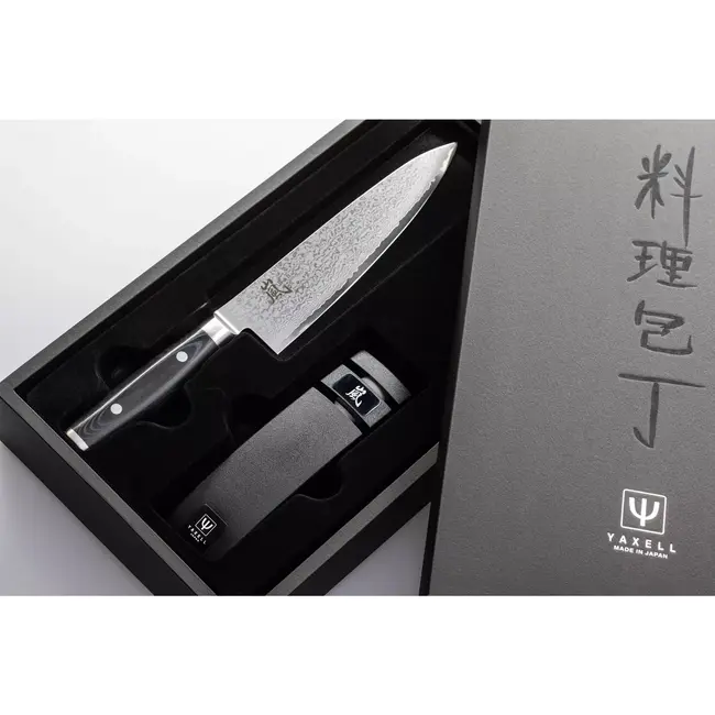 De meegeleverde Yaxell messenslijper maakt het gemakkelijk om je mes in perfecte staat te houden. Dankzij de eenvoudige gebruiksvriendelijkheid van de slijper blijven je messen altijd scherp, klaar voor elke snijtaak.