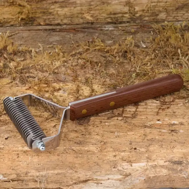 Deze klittenkam kenmerkt zich door zijn roestvrije messen en een handvat van Bubinga hout, FSC-gecertificeerd. De speciale vorm van de kam zorgt ervoor dat u diep in en onder de vacht kunt komen, waardoor het verwijderen van losse haren en klitten een fluitje van een cent wordt.