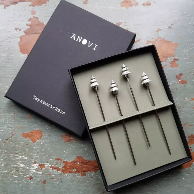 Anovi, Tapasprikkers, Kerstboompje, Zilvertin, Ambachtelijk Gemaakt, Nederlands Product, Feestelijke Tafelaccessoires, Kerstdecoratie, Cadeau-idee, Stijlvolle Keukentools, Elegante Serveeraccessoires.