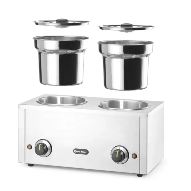 Dit thermosysteem is gemaakt van hoogwaardig roestvrij staal, wat zorgt voor een lange levensduur en eenvoudige reiniging. De antislipvoeten zorgen ervoor dat het apparaat stevig op zijn plaats blijft staan, zelfs in drukke keukens. Bovendien wordt het geleverd met twee roestvrijstalen pannen van 4 liter elk, compleet met deksels die voorzien zijn van een lepeluitsparing.