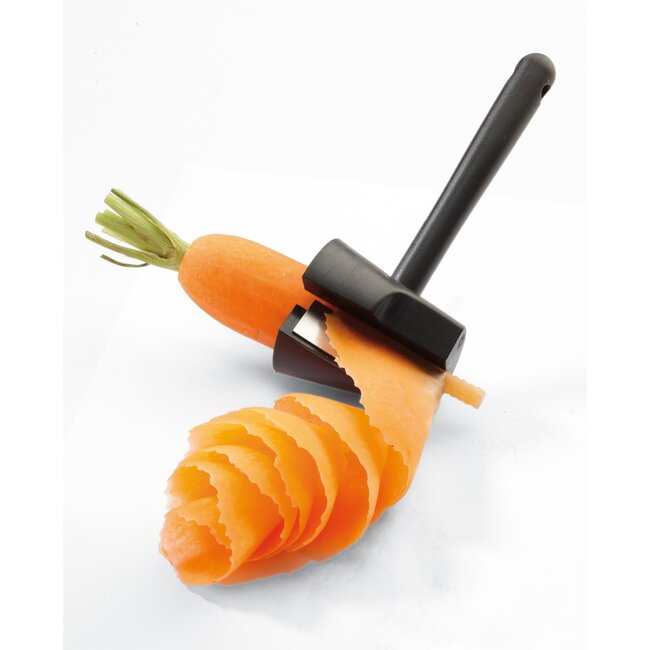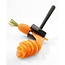 Wortels etc. worden als een puntenslijper door de snijder gedraaid. Met de geïntegreerde golfsnijder kunnen vooraf inkepingen in de groenten worden gesneden om de slingers een gefranjerde look te geven.